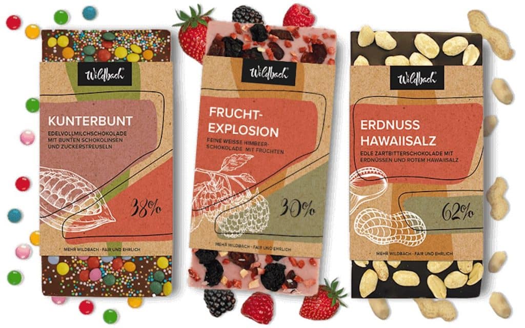 - Wildbach Schokolade – Edle Schokoladen aus besten, fair gehandelten Rohstoffen, mit viel Liebe und handwerklicher Sorgfalt in Bayern hergestellt. Unter dieser Marke beliefern wir Fachhändler, Feinkostgeschäfte, Gastronomiebetriebe, den Einzelhandel sowie Produzenten – sowohl mit hochwertigen Rohstoffen als auch mit unseren feinsten Schokoladenprodukten.